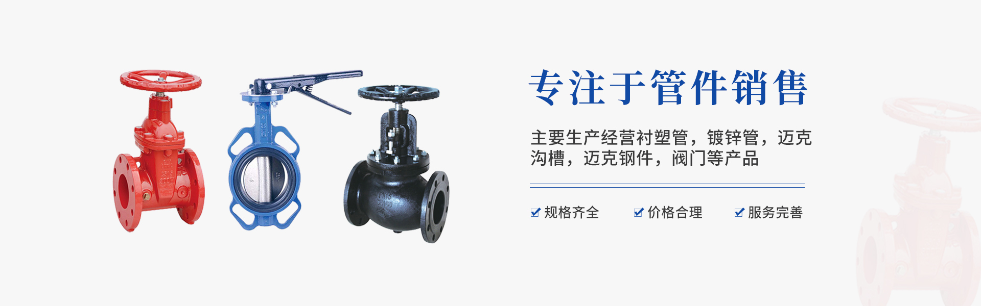 主要生產(chǎn)經(jīng)營襯塑管,鍍鋅管,邁克溝槽,邁克鋼件,閥門等產(chǎn)品